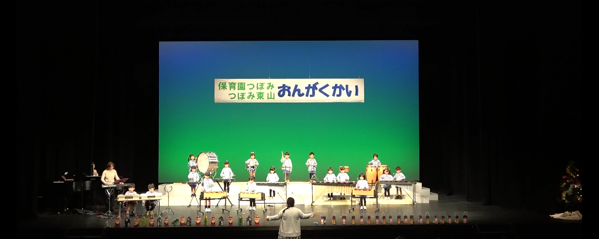 3歳児はリズム打合奏、4・5歳児は様々な楽器を使って器楽合奏を演奏します。